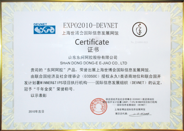1991年08月“东阿”牌阿胶荣获传统药 “长城”国际金奖。